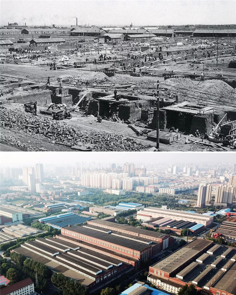 ↑這是一張拼版圖片,上圖為上世紀(jì)五十年代,全面基礎(chǔ)工程接近尾聲時(shí)的工廠(資料圖片);下圖為9月4日無(wú)人機(jī)拍攝的哈電電機(jī)廠房局部(新華社記者王建威攝)。