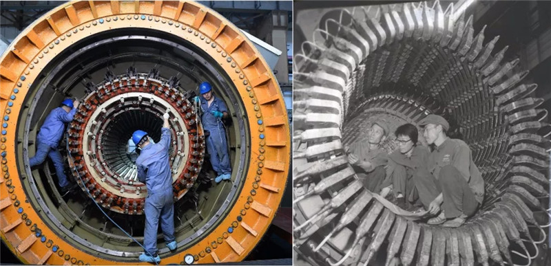↑這是一張拼版圖片,左圖為9月2日拍攝的火電定子下線生產(chǎn)場(chǎng)景(新華社記者王建威攝);右圖為上世紀(jì)六七十年代的火電定子下線生產(chǎn)場(chǎng)景(資料圖片)。