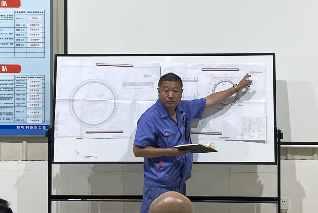 AP1000主泵電機是第三代核電技術,AP1000定子鐵心裝壓的裝配方式與國內外任何電機都不同,它采用的定子裝壓胎具膨脹心軸是從國外進口的,這是一個新型的設計理念,一切需要從零開始。他與工藝人員集思廣益,深入研究,針對AP1000定子鐵心裝壓制定了專項工藝守則,將此項技術固化下來,為后續(xù)定子鐵心裝壓提供了技術指導。此項“大型屏蔽電機定子鐵心裝壓工藝”獲得了國家專利。2017年3月,動裝公司CAP1000項目首臺夾套熱套圓滿完成。夾套熱套工作屬于關鍵工序且難度較大,工藝要求極高,因內夾套表面布滿水道,所以在夾套熱套過程中,保持內夾套與外夾套水平居中至關重要。一旦出現偏差,極有可能在外夾套低端面與某一高度水道邊緣處造成磕傷。此外,由于夾套表面較薄,散熱較快,很容易冷卻收縮后抱死,依據文件要求工件出爐到完成熱套必須控制在8分鐘以內。正式操作前,他給團隊成員做好技術交底,測量內、外夾套圓度,調整十字吊梁水平,操作中穩(wěn)中有快,一氣呵成。